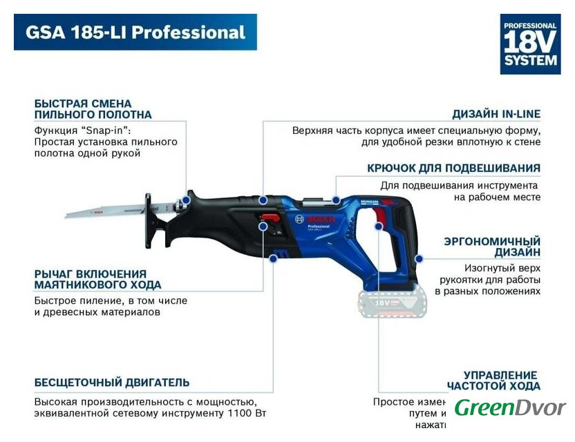 Комплектация | Пила GSA 185-LIПильное полотно S 123 X “Progressor for wood”Пильное полотно S 2345 X “Progressor for metal”Инструкция по эксплуатацииКартонная коробка |
