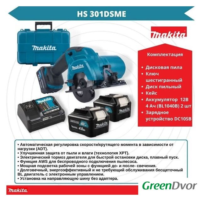 Комплектация | - Дисковая пила;- 2 аккумулятора;- Зарядное устройство;- Твердосплавный диск;- Шестигранный ключ;- Кейс. |