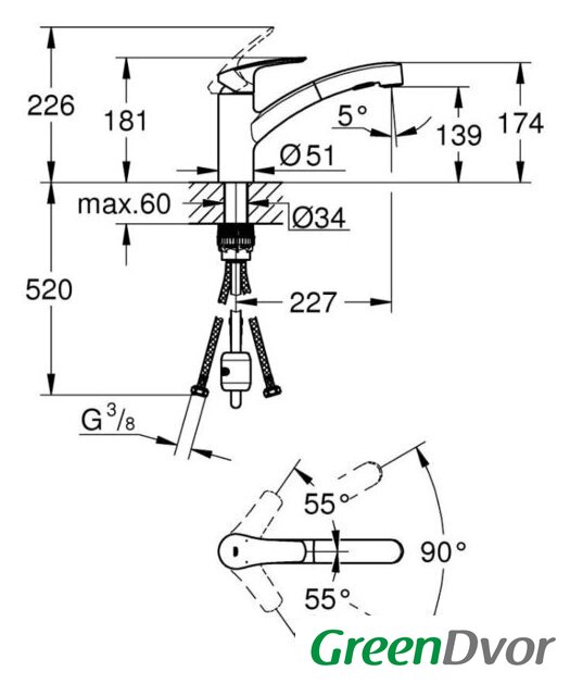 | Длина (вылет) излива | 227 мм |
