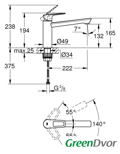 | Поворотный излив | 140 ° |