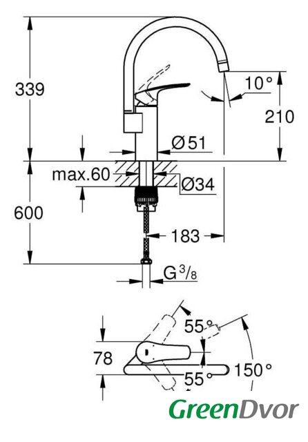 | Поворотный излив | 150 ° |