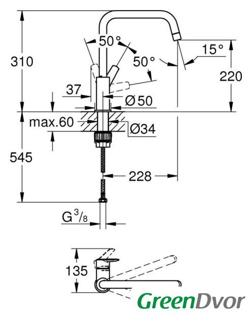| Поворотный излив | 150 ° |