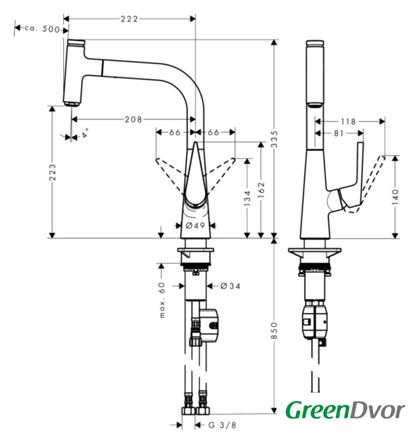 | Поворотный излив | 150 ° |
