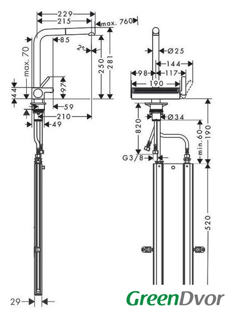 | Поворотный излив | 60 ° (или 110° или 150°) |
