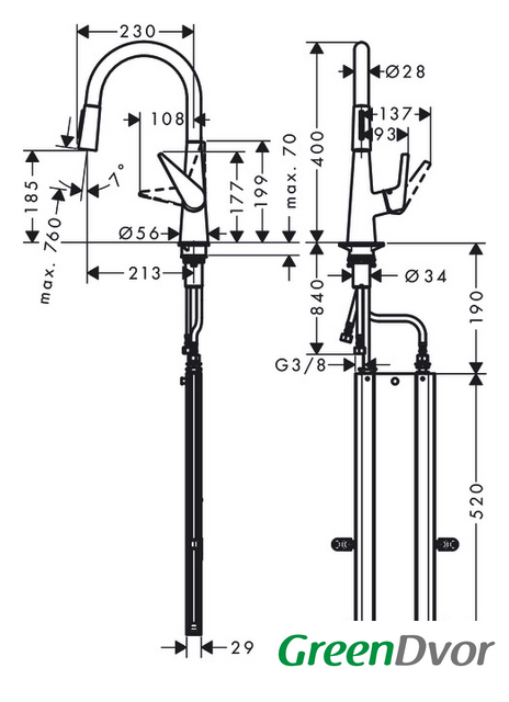 | Поворотный излив | 150 ° |