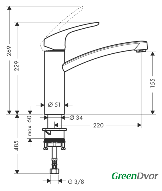 Длина (вылет) излива 220 мм