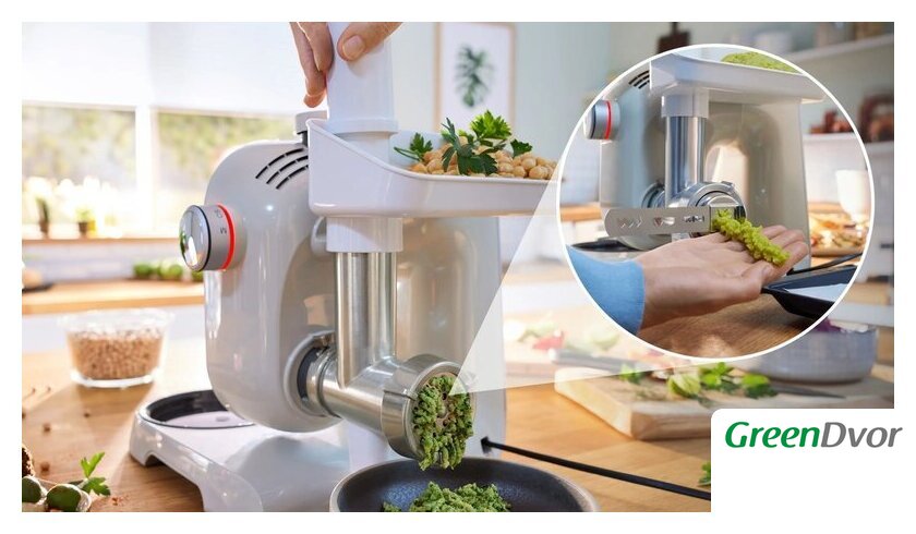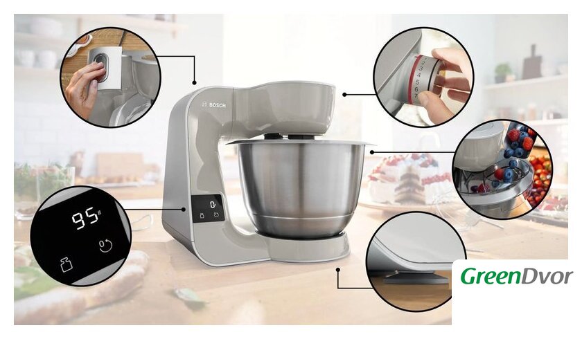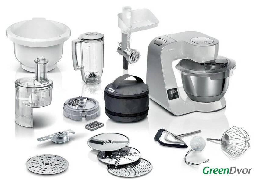 | Функции | мясорубка, блендер, взбивание, смешивание, замешивание дрожжевого теста, измельчитель, рубка, терка, шинковка, ломтерезка, нарезание кубиками, драники |