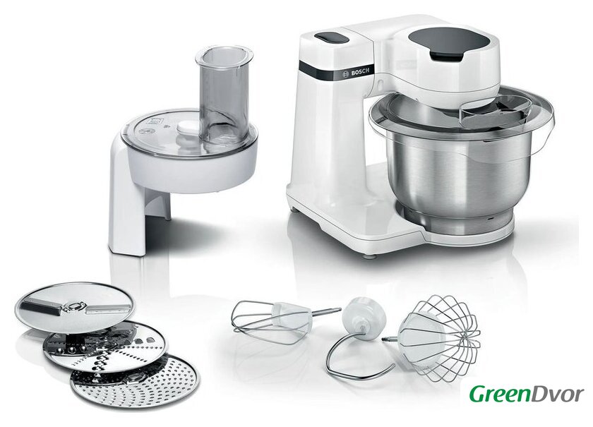 | Полная комплектация | Измельчитель овощей и фруктов с 3 сменными дисками из нержавеющей стали (5 функций): двусторонний диск для нарезки (крупная и мелкая), двусторонний диск для нарезки (крупная и мелкая) и диск для мелкой терки. 3 профессиональных миксера порадуют каждого любителя точной и быстрой работы: насадка для смешивания с силиконом, насадка для венчика и крюк для теста. |