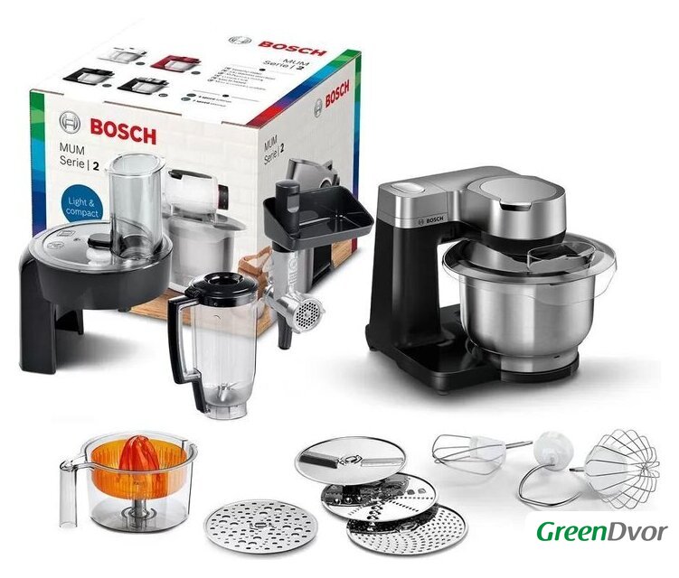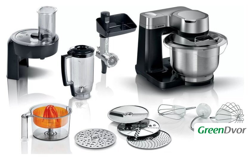 | Функции | мясорубка, блендер, цитрус-пресс, взбивание, смешивание, замешивание дрожжевого теста, терка, шинковка, ломтерезка, драники |
