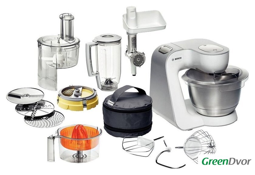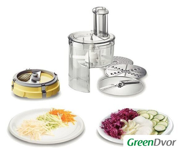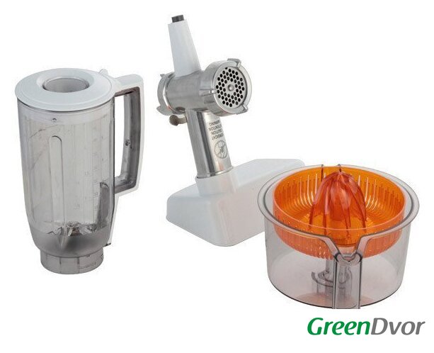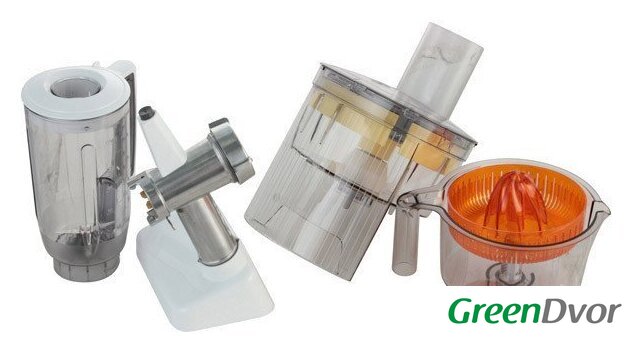 | Функции | мясорубка, блендер, цитрус-пресс, взбивание, смешивание, замешивание дрожжевого теста, терка, шинковка, ломтерезка, нарезание кубиками |