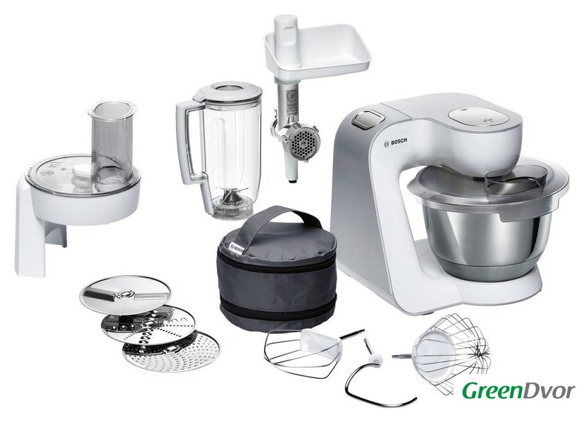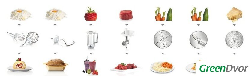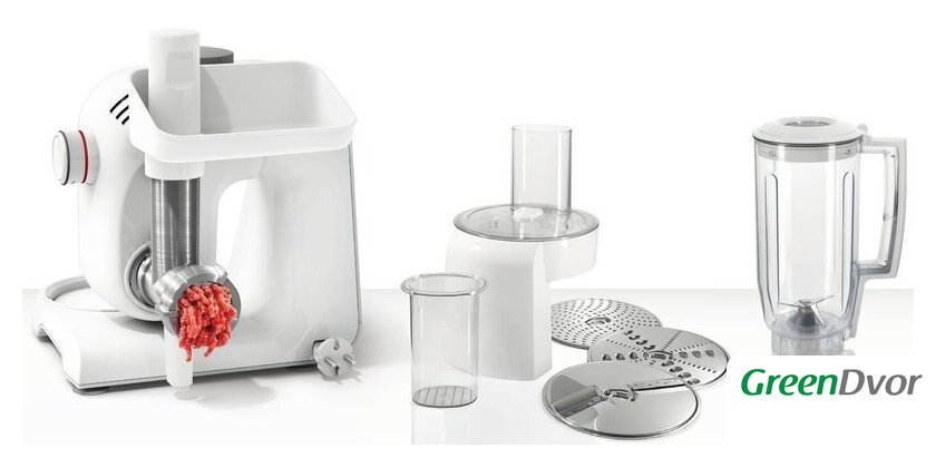 | Функции | мясорубка, блендер, взбивание, смешивание, замешивание дрожжевого теста, терка, шинковка, ломтерезка |