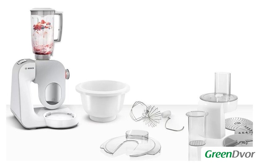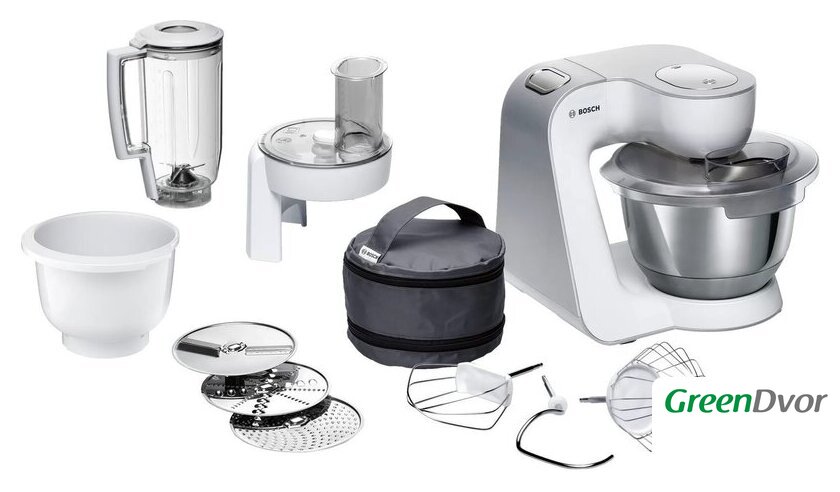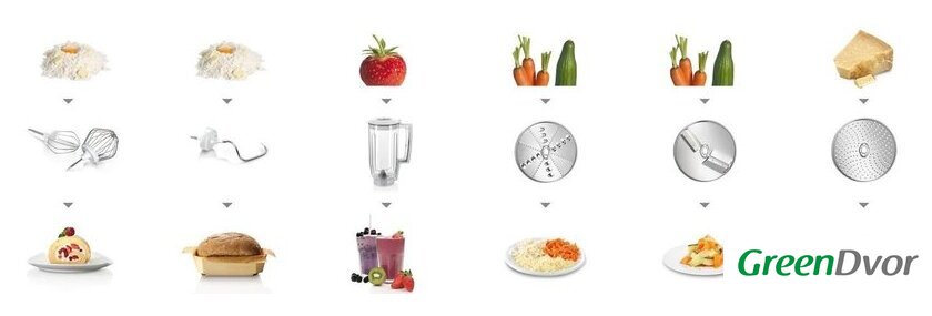 | Функции | блендер, взбивание, смешивание, замешивание дрожжевого теста, терка, шинковка, ломтерезка |