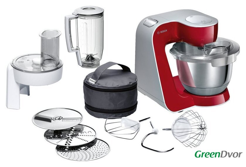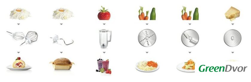 | Функции | блендер, взбивание, смешивание, замешивание дрожжевого теста, терка, шинковка, ломтерезка |