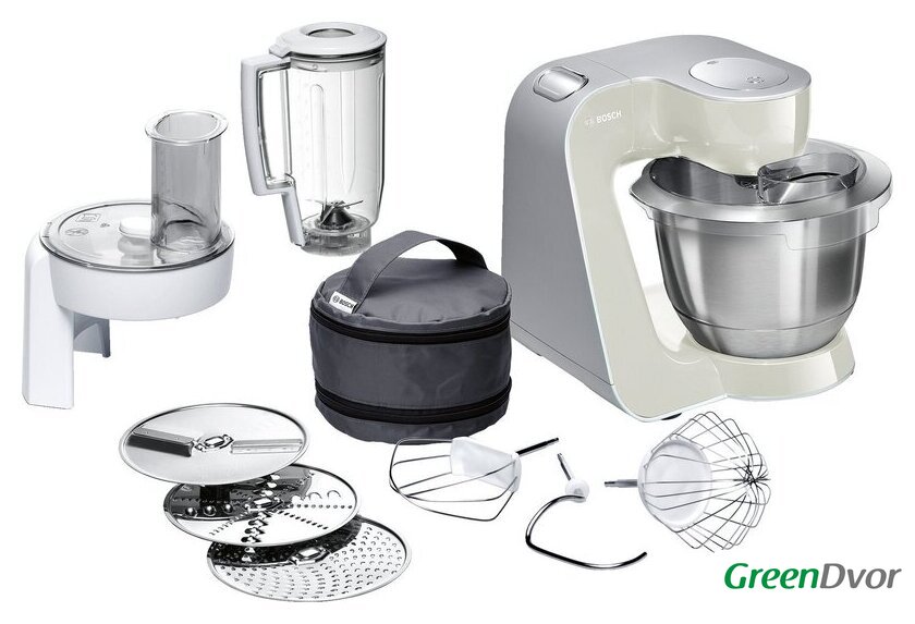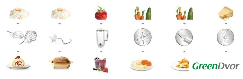 | Функции | блендер, взбивание, смешивание, замешивание дрожжевого теста, терка, шинковка, ломтерезка |