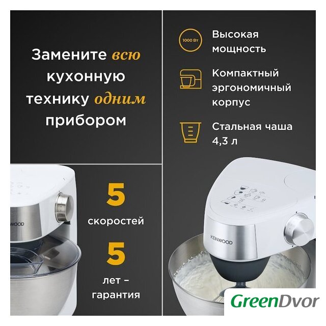 | Функции | блендер, цитрус-пресс, взбивание, смешивание, замешивание дрожжевого теста, измельчитель, рубка, терка, шинковка, ломтерезка, драники |