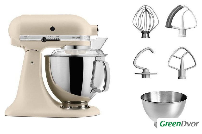 | Полная комплектация | стальная чаша объемом 4,8 л;cтальная чаша объемом 3 л;проволочный венчик;крюк для теста;лопатка для смешивания;лопатка с гибким ребром;защитный обод |