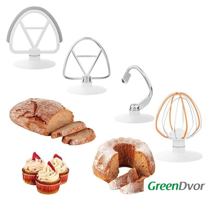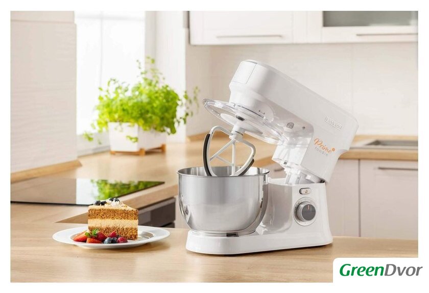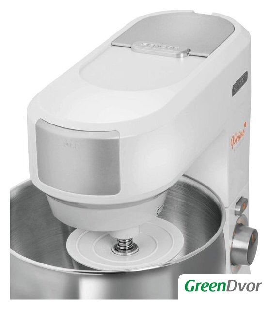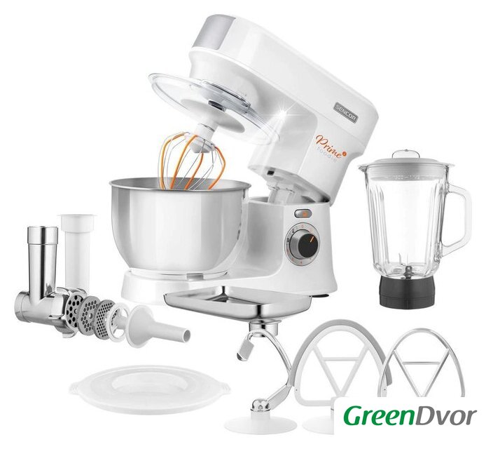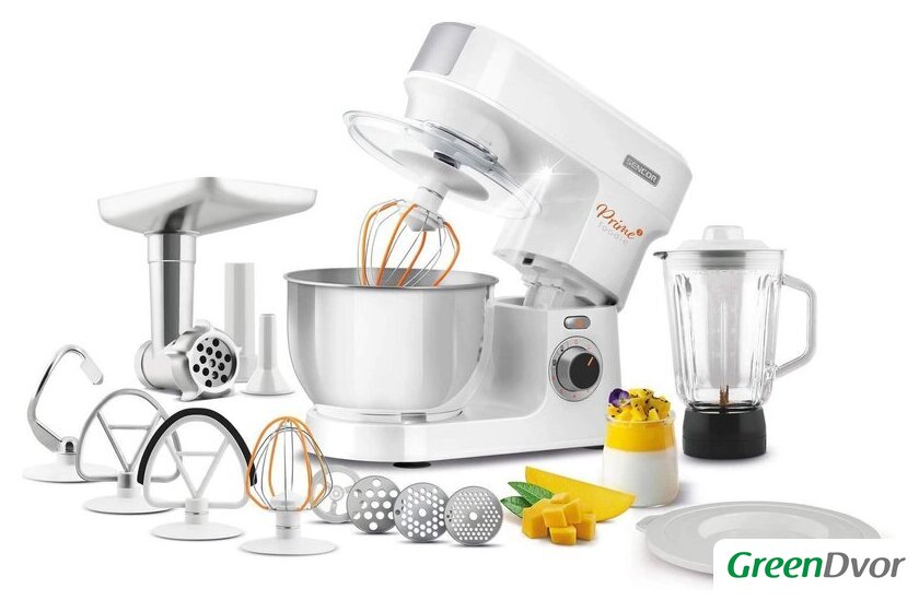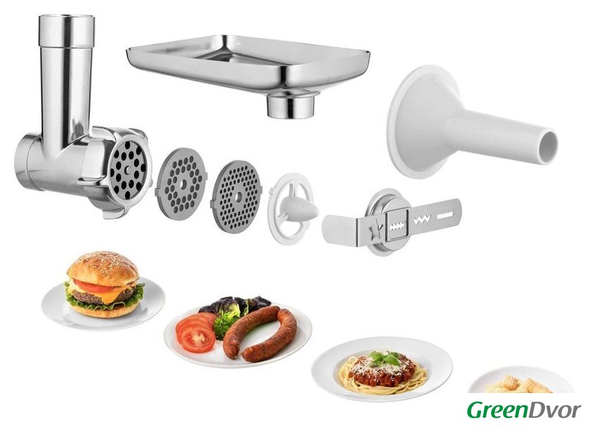 | Полная комплектация | кухонная машинаметаллическая чаша 4,5 лвенчик крюк для тестанасадка для смешивания густых масснасадка для смешивания с силиконовыми вставкамизащитная крышка от брызгнасадка для мясорубки с насадками для тонкого и грубого измельчения, насадка для колбас, насадка для печенья |