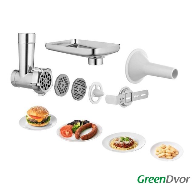 | Полная комплектация | Стеклянная чаша блендера 1,5лЧаша миксера 4,5лДве насадки для смешиванияНасадка для тестаВенчикМясорубка с насадками для регулировки степени измельчения, набивки колбас и насадкой-шаблоном для формовки печеньяТолкатель |