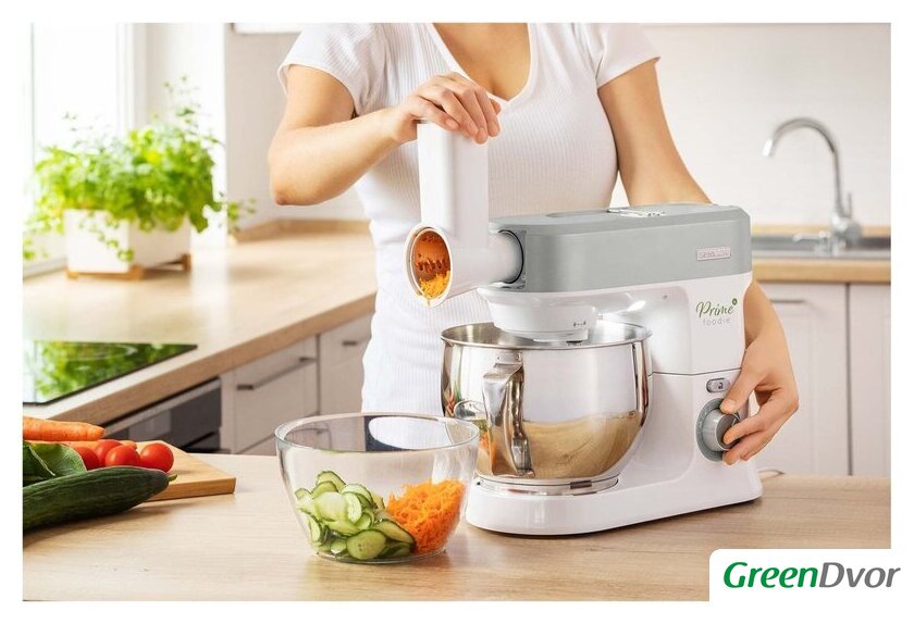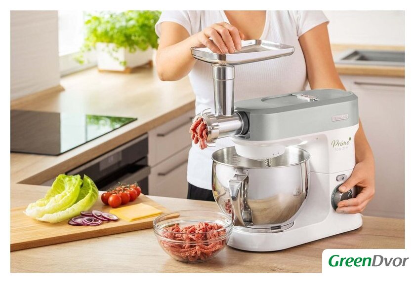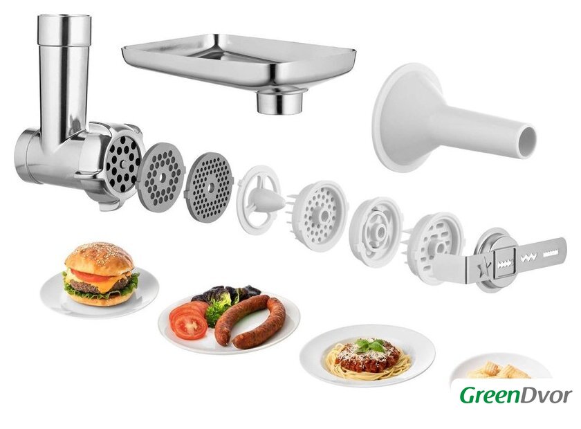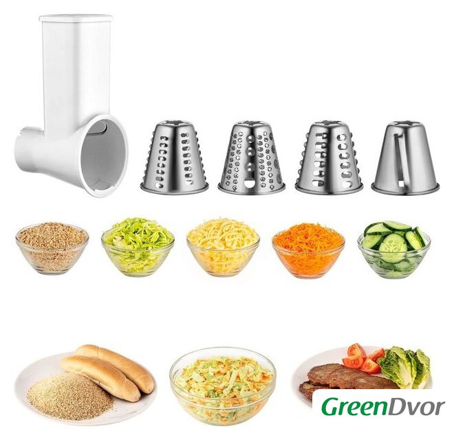 | Функции | мясорубка, блендер, взбивание, смешивание, замешивание дрожжевого теста, терка, шинковка, ломтерезка, драники |