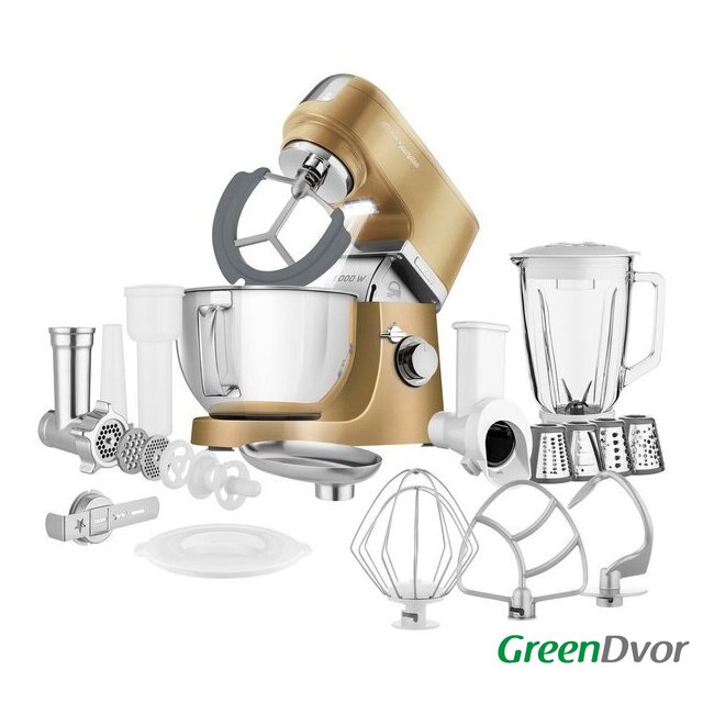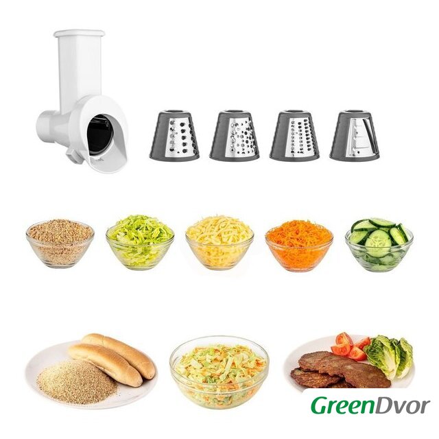 | Функции | мясорубка, блендер, взбивание, смешивание, замешивание дрожжевого теста, терка, шинковка, ломтерезка, драники |