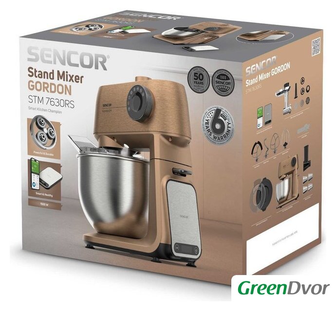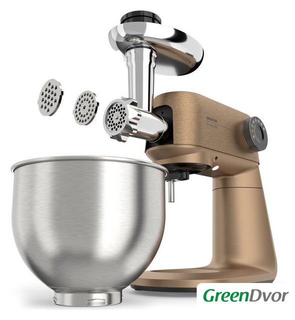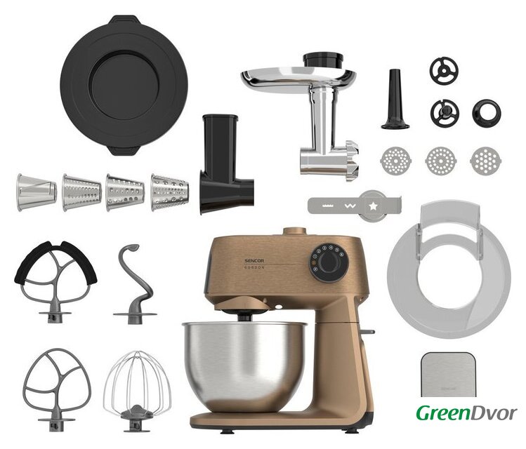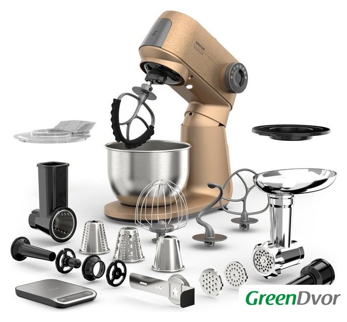 | Полная комплектация | чаша из нержавеющей стали 5.5 л с мерной шкалой; 4 металлических насадки с антипригарным покрытием; мясорубка для грубого и мелкого помола; насадка для колбас 2 диаметров; насадка для печенья; нож и терка с 4 конусами из нержавеющей стали; защитная крышка; крышка для хранения; интеллектуальные весы |
