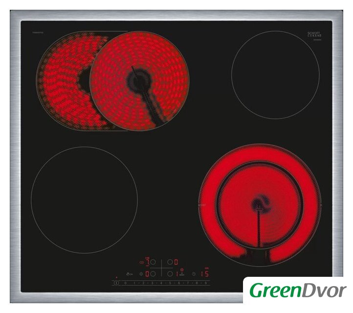 | Подробная информация о конфорках | Передняя левая, кВт 2Задняя левая, кВт 1.8Передняя правая, кВт 1.2/3Задняя правая, кВт 1.2 |