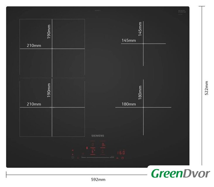 | Подробная информация о конфорках | 2 конфорки размером 19,0 x 21,0 см мощностью по 2,5 кВт (максимум 3,7 кВт), 1 конфорка диаметром 14,5 см мощностью 1,6 кВт (максимум 2,2 кВт), 1 конфорка диаметром 18,0 см мощностью 2,0 кВт (максимум 3,1 кВт) |