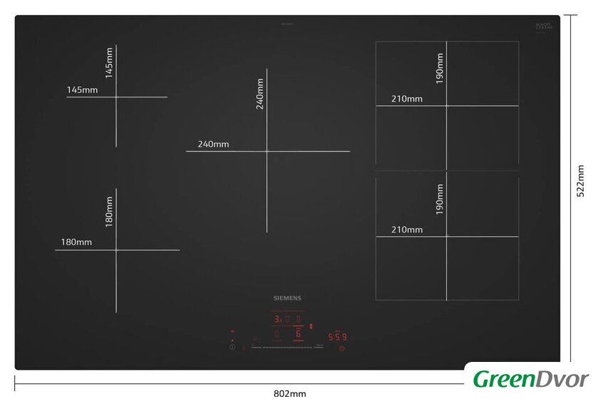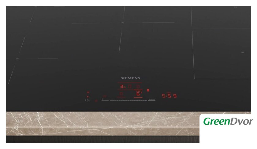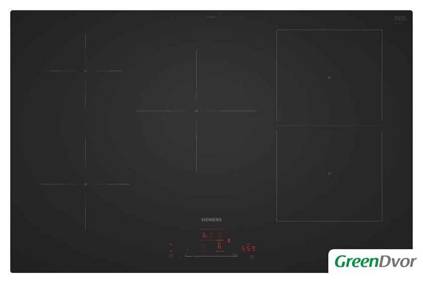 | Подробная информация о конфорках | 1 конфорка диаметром 18 см, мощность 1.6 (2.2) кВт; 1 конфорка диаметром 14.5 см, мощность 2.0 (3.1) кВт; 1 конфорка диаметром 24 см, мощность 2.5 (3.7) кВт; 2 прямоугольные конфорки размером 19.0 x 21.0 см, мощность 2.5 (3.7) кВт каждая |