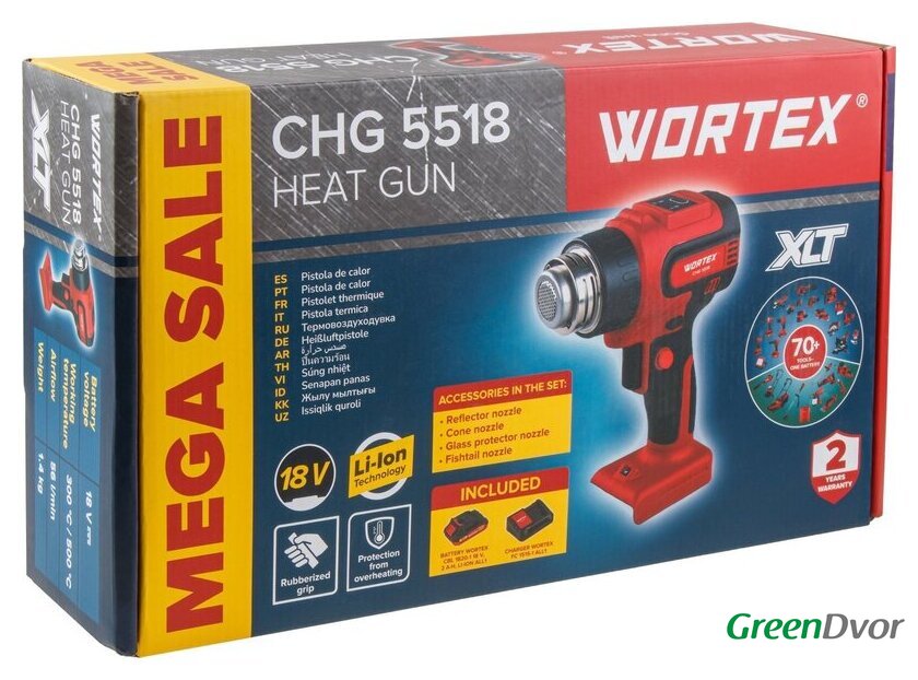 Комплект поставки | - Аккумулятор WORTEX CBL 1820-1 - 1 шт;- Зарядное устройство WORTEX FC 1515-1 - 1 шт.; - Рефлекторное сопло - 1 шт.;- Коническое сопло - 1 шт.;- Стеклозащитное сопло - 1 шт.;- Насадка рыбий хвост - 1 шт.;- Паспорт; |