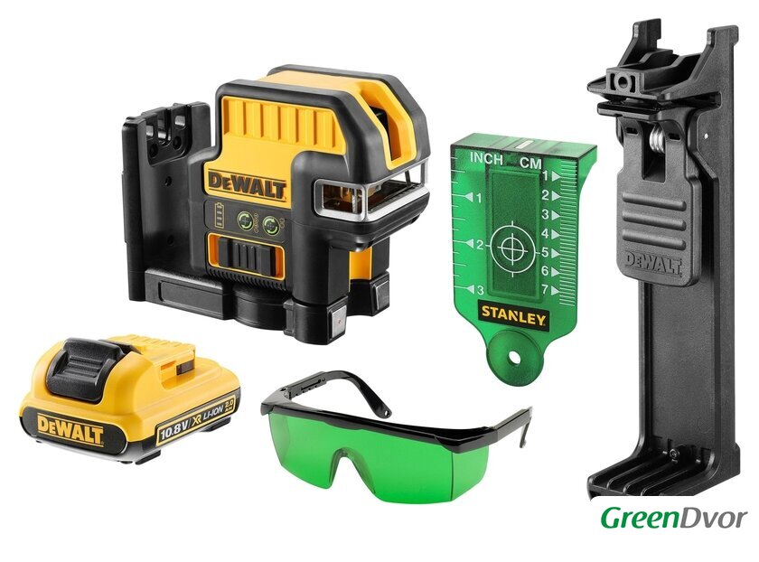 Комплект поставки | - Лазерный построитель плоскостей;- Кронштейн для подвесных потолков;- Мишень;- Очки для зеленого лазерного луча;- Аккумуляторная батарея 10.8 В, 2 Ач;- Зарядное устройство;- Кейс TSTAK. |