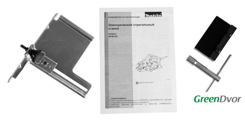 Комплект поставки | Шаблон для установки ножа, Ограничитель глубины выборки паза, Параллельный упор, Лезвия для рубанка, Торцевой гаечный ключ |