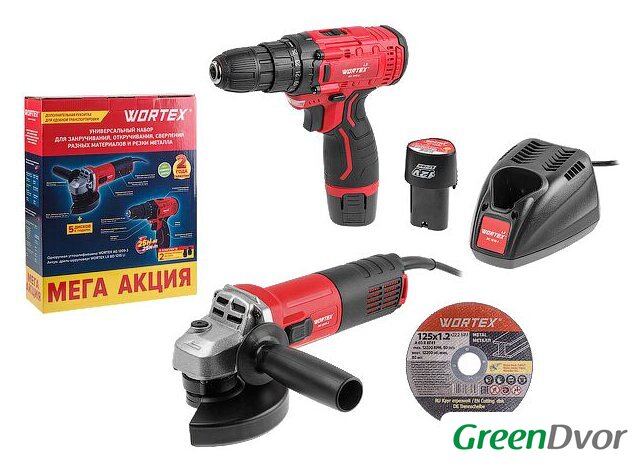 Комплектация | Аккум. дрель-шуруповерт WORTEX LX BD 1215 Li - 1 шт.;Одноручная углошлифмашина WORTEX AG 1209-3 - 1 шт.;Аккумулятор WORTEX BLX 1215, 1.5 А*ч - 2 шт.;Зарядное устройство WORTEX SC 1515-1, 1.2 A - 1 шт.;Отрезной круг WORTEX 125x1,2x22,2 мм - 5 шт. |