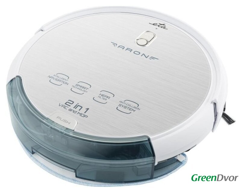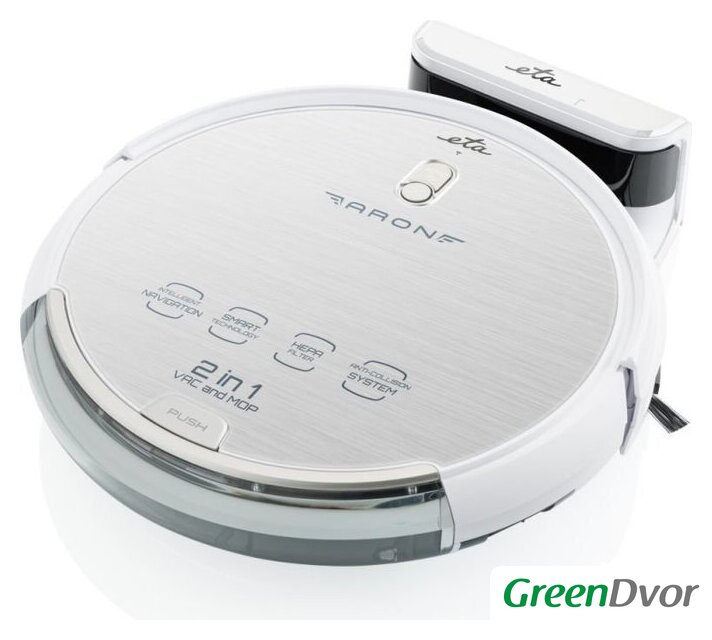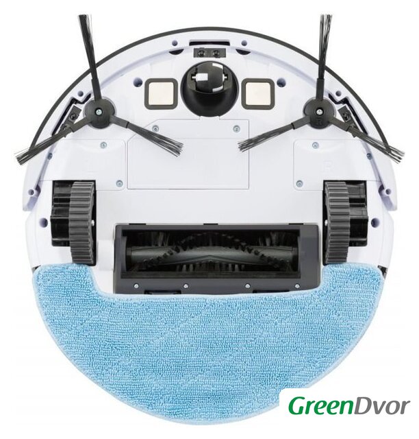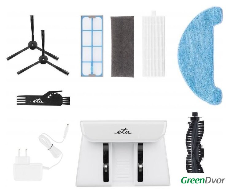 Комплектация | заряднуая база, адаптер питания, пульт дистанционного управления, виртуальная стена, щетка для чистки, насадка для мытья полов с резервуаром для воды на 300 мл и ткань для мытья полов . |