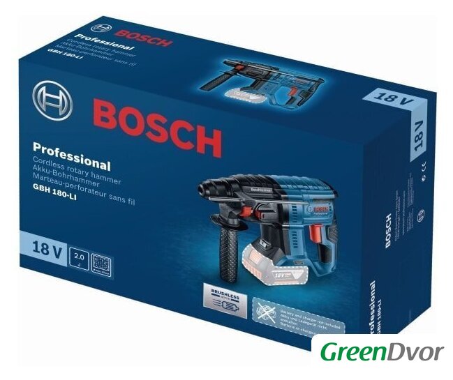 | Комплект поставки | - Перфоратор GBH 180-LI Professional- Дополнительная рукоятка 1 602 025 08X- Салфетка (№ запасной части 1 619 200 413);- Ограничитель глубины 1 613 001 003%- Коробка |