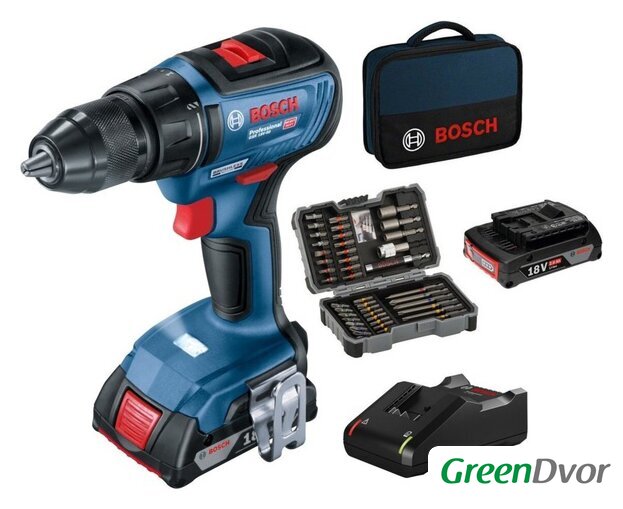 Комплектация | - Аккумуляторная дрель-шуруповёрт;- 2 аккумулятора 2,0 Ач;- Зарядное устройство GAL 18V-20;- Набор бит - 43 шт;- Текстильная сумка |