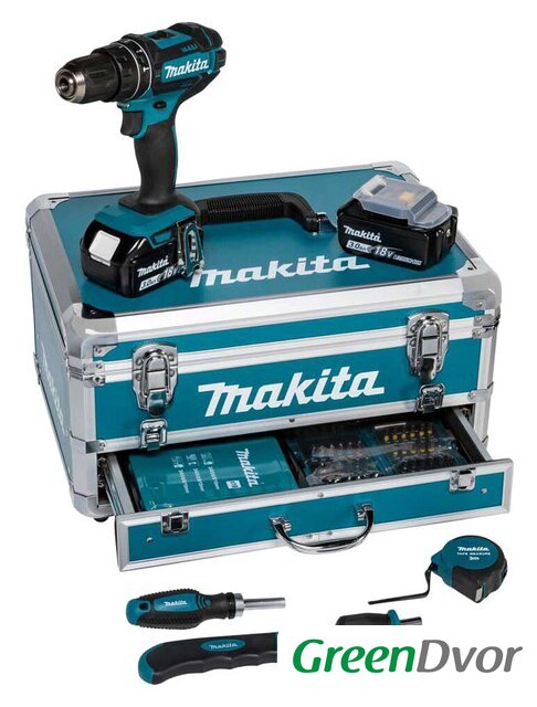 Комплектация | - DHP482- Алюминиевый ящик (197019-9)- Быстрозарядное устройство DC18RC (195584-2)- 2x аккумуляторная батарея BL1830B (197599-5)- Сверлильный патрон 13 мм (199154-9)- Крышка аккумуляторного отсека (450128-8)- Двойная бита (784636-0)- 2 набора бит (B-28606)- Набор сверл (D-46202)- Нож с отламывающимся лезвием (D-65713)- Измерительная лента (Q485) |