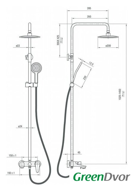 | Комплектация | верхний душ, штанга, ручной душ (лейка), держатель лейки, шланг, смеситель, излив для ванны |