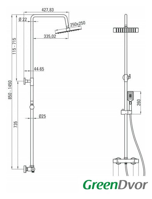 | Комплектация | верхний душ, штанга, ручной душ (лейка), держатель лейки, шланг, смеситель, излив для ванны |