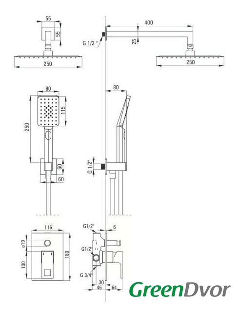 | Диаметр (ширина) верхнего душа | 250 мм |