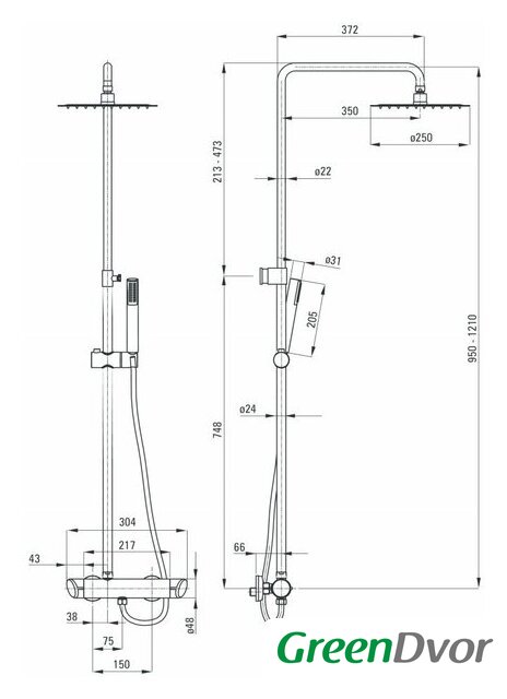 | Диаметр (ширина) верхнего душа | 250 мм |