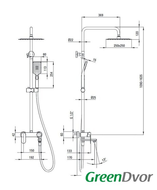| Комплектация | верхний душ, штанга, ручной душ (лейка), держатель лейки, шланг, смеситель, излив для ванны |
