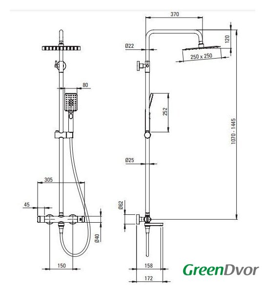 | Комплектация | верхний душ, штанга, ручной душ (лейка), держатель лейки, шланг, смеситель, излив для ванны |