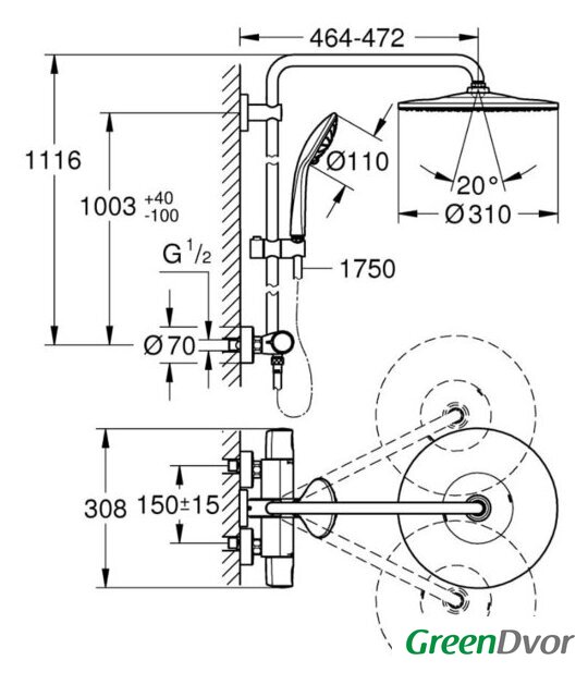 | Вылет верхнего душа | 472 мм |