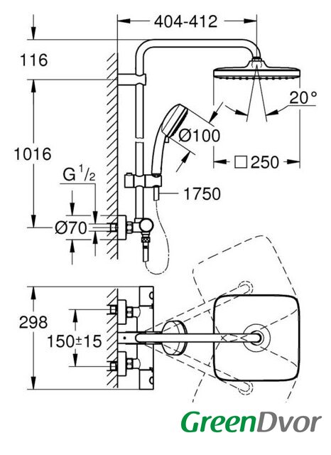 | Диаметр (ширина) верхнего душа | 250 мм |