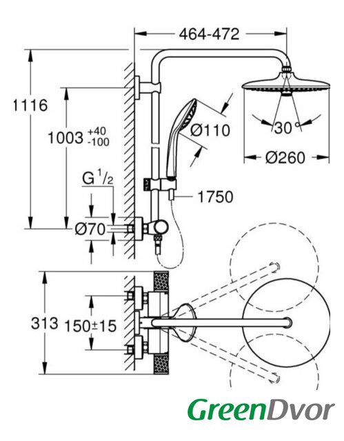 | Диаметр (ширина) верхнего душа | 260 мм |