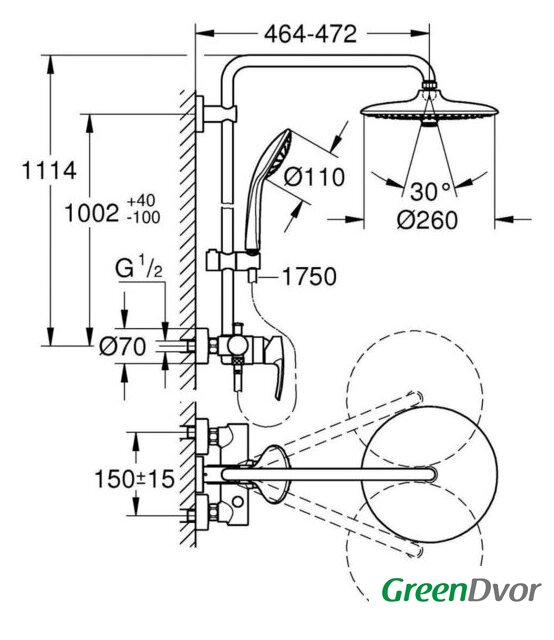 | Диаметр (ширина) верхнего душа | 260 мм |