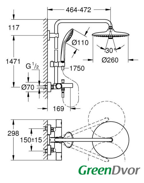 | Вылет верхнего душа | 464 мм |