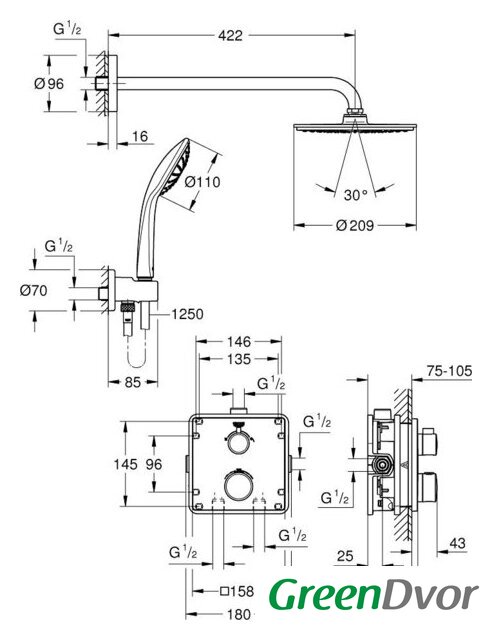 | Диаметр (ширина) верхнего душа | 210 мм |