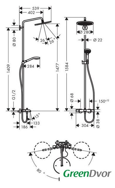 | Диаметр (ширина) верхнего душа | 280 мм |