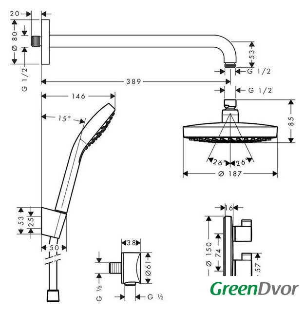| Комплектация | верхний душ, ручной душ (лейка), держатель лейки, шланг, смеситель |